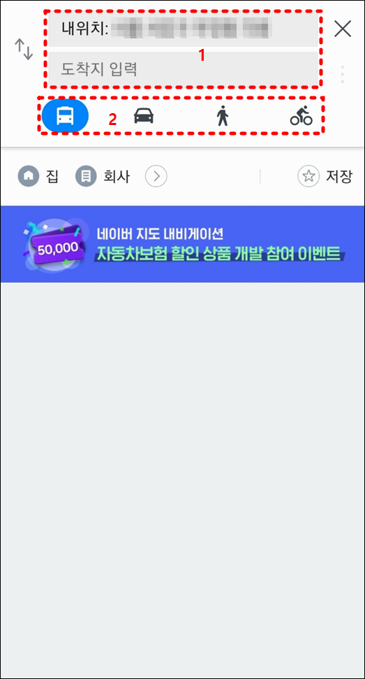 1) 대중교통, 자동차, 도보, 자전거 중 길 찾기를 이용할 방법을 선택할 수 있습니다.