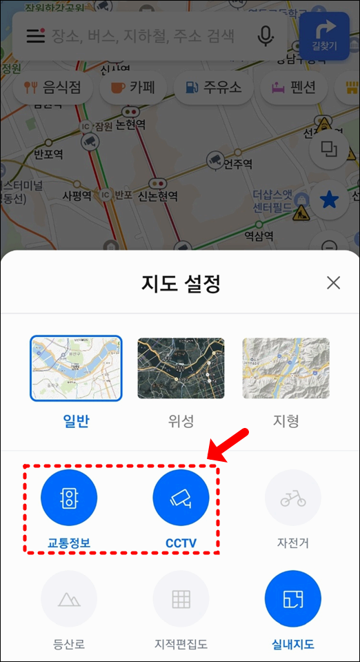 1. 오른쪽 상단 네모 아이콘 클릭 ‣ 교통정보/CCTV 눌러서 파란색으로 활성화시켜 주세요.