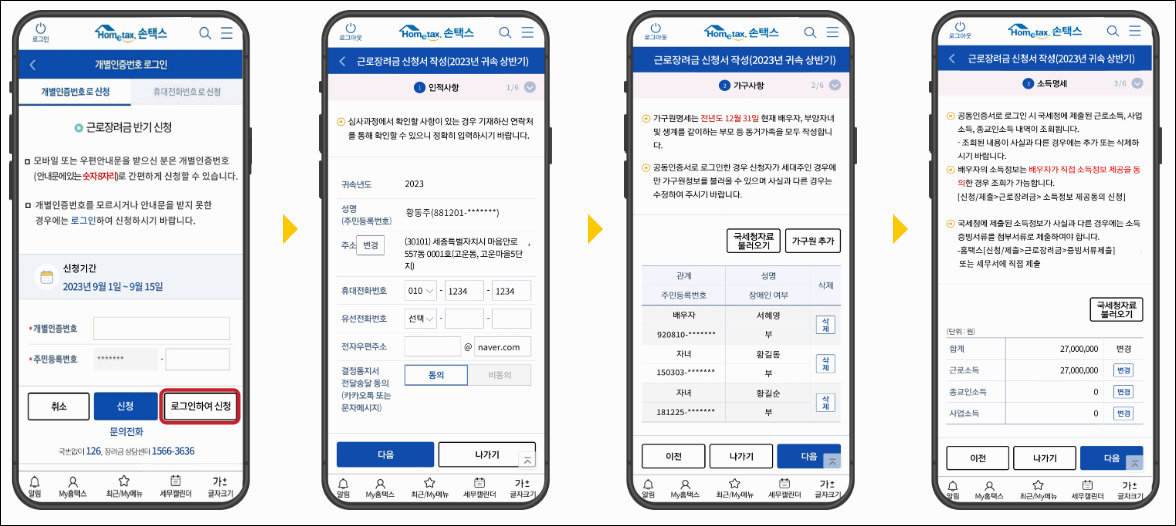 • 홈택스 모바일앱 : 모바일 앱 접속 ‣ 신청/제출 클릭 ‣ 반기/정기 신청 클릭 ‣ 신청하기 ‣ 본인인증 로그인 ‣ 인적/가구사항 입력 ‣ 소득명세 작성 ‣ 전세금 명세 ‣ 계좌번호 작성 ‣ 신청확인 및 전송