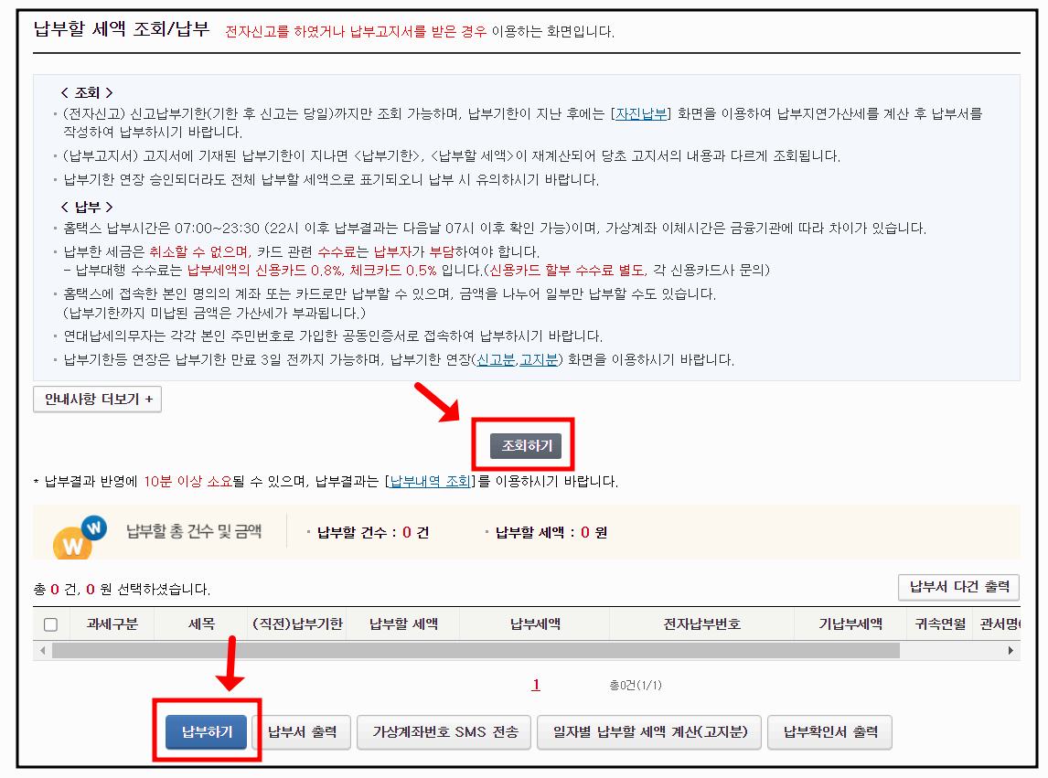 카드로 택스 또는 인터넷지로 홈페이지 로그인 > 국세 클릭 > 조회납부 또는 자진납부 클릭 > 납부하기 > 결제수단선택(신용카드, 간편 결제, 계좌이체)